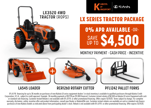 0% A.P.R. financing for up to 36 months on purchases of new Kubota LX series equipment dealers’ in-stock inventory is available to qualified purchasers through Kubota Credit Corporation, U.S.A.; subject to credit approval. Example: 36 monthly payments of $27.78 per $1,000 financed. Customer instant rebate of $4,500 on Kubota LX series Equipment with cash or standard rate financing. Customer Instant Rebate is not available with 0% A.P.R. or other promotional financing. Offers expire 12/31/25. Terms subject to change. For complete warranty, disclaimer, safety, incentive offer and product information, consult your Dealer or KubotaUSA.com. Customer instant rebates are available on cash or standard rate finance purchases of new Kubota models as indicated above from participating dealer's stock. Rebate is not available with 0% A.P.R. or other promotional financing. Offer expires 12/31/25.